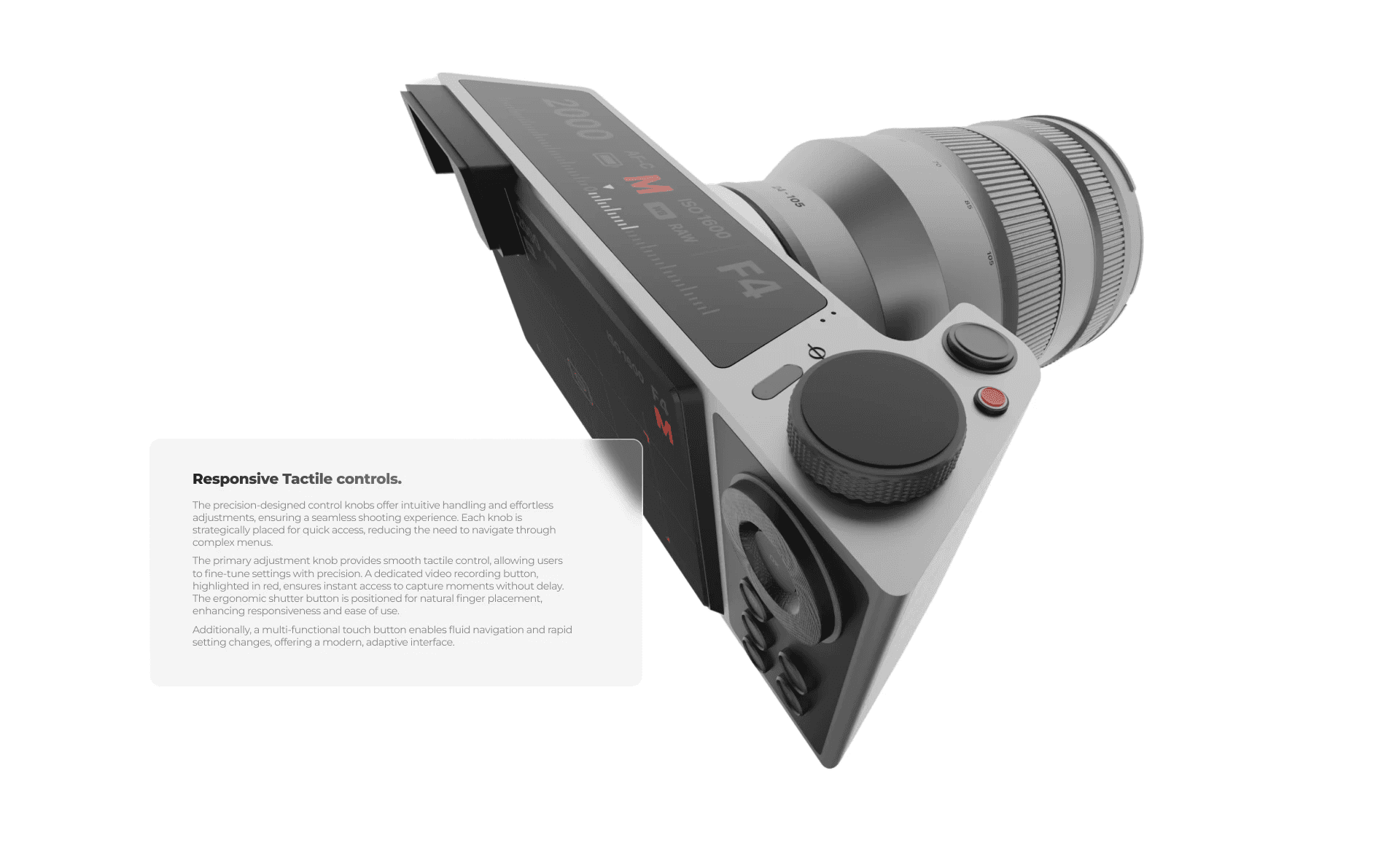 It reduces visible controls to only what is essential, uses form to communicate function, and relies on physical interaction rather than layered menus. The design emphasizes calm surfaces, strong geometry, and intuitive grip points, allowing the creator to stay present in the moment of capture.