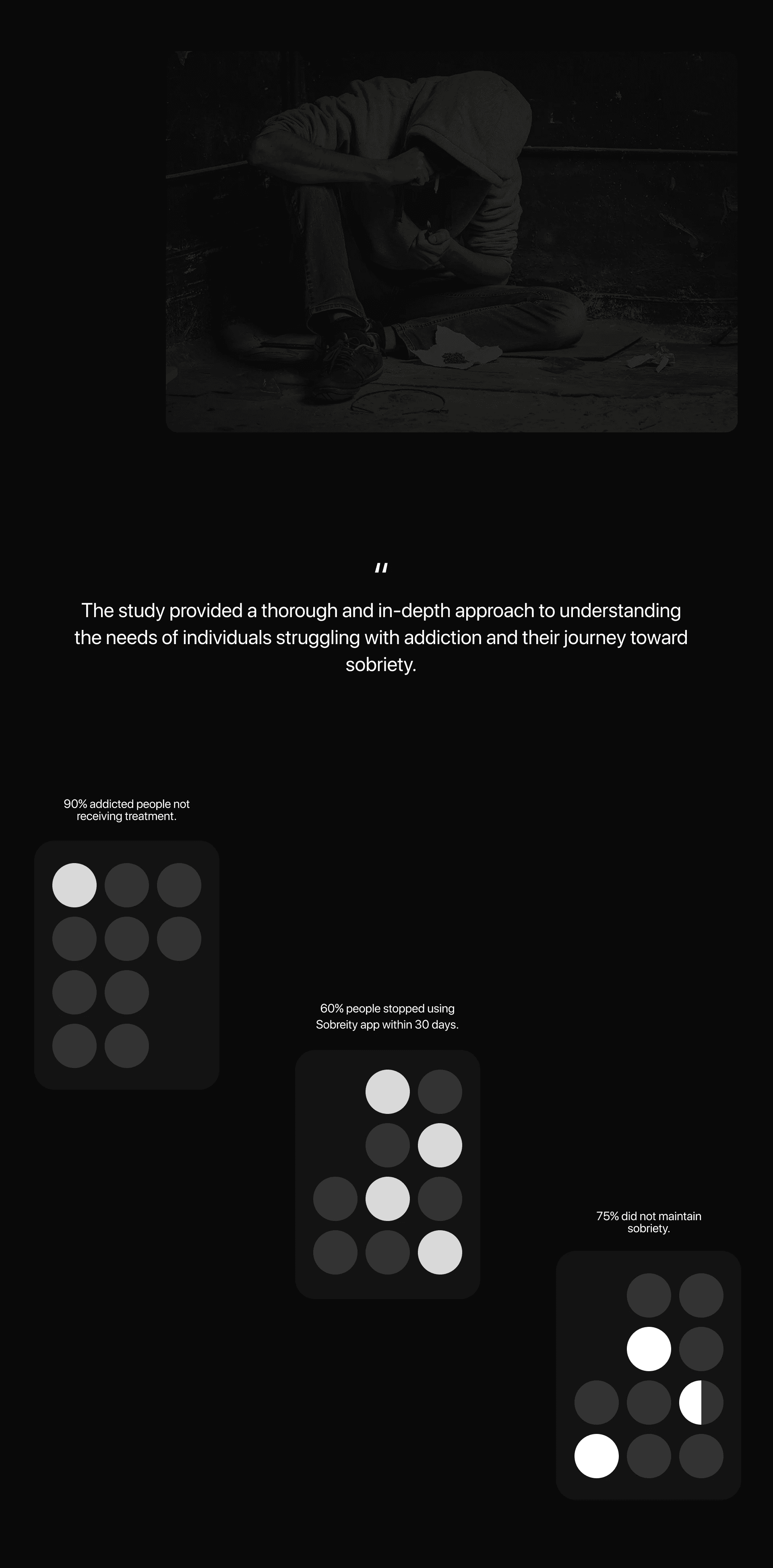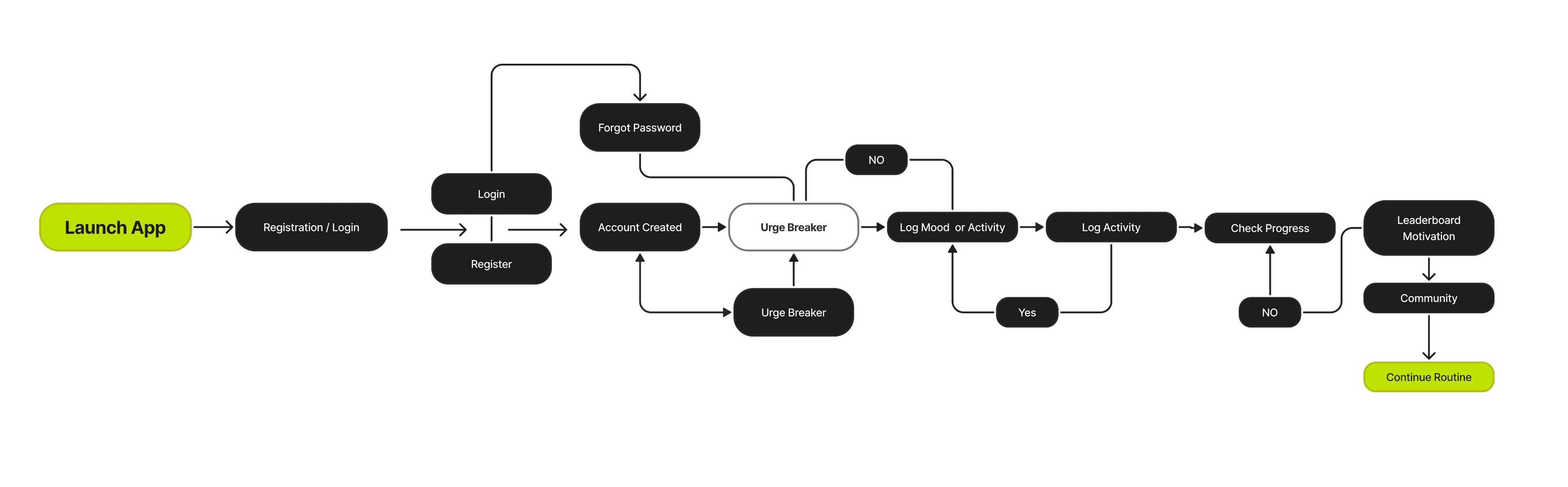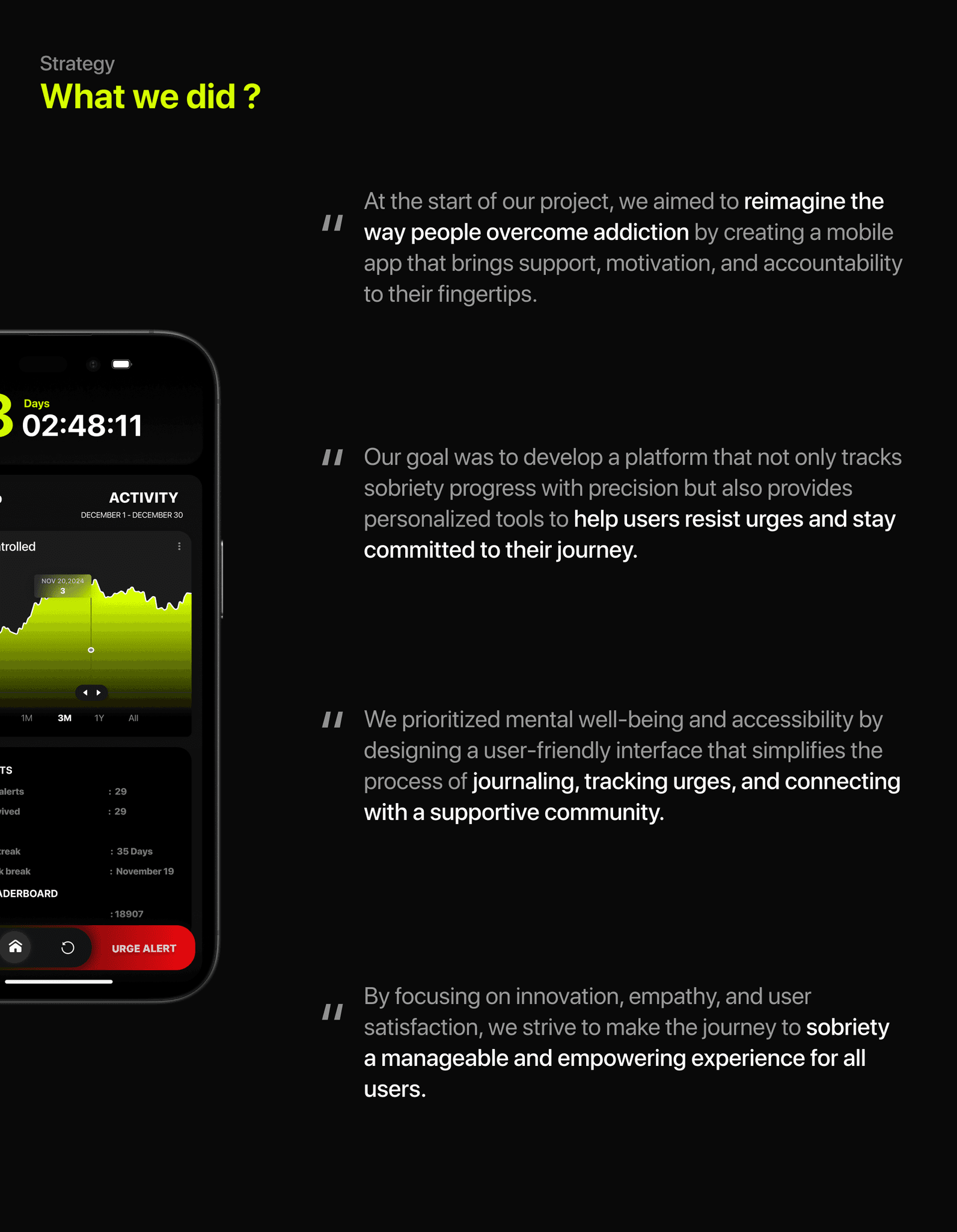 The UI uses calm colors and minimal visual noise to avoid overstimulation. Important actions like urge breakers and the sober timer are always easy to reach, so users do not have to think or search during cravings.