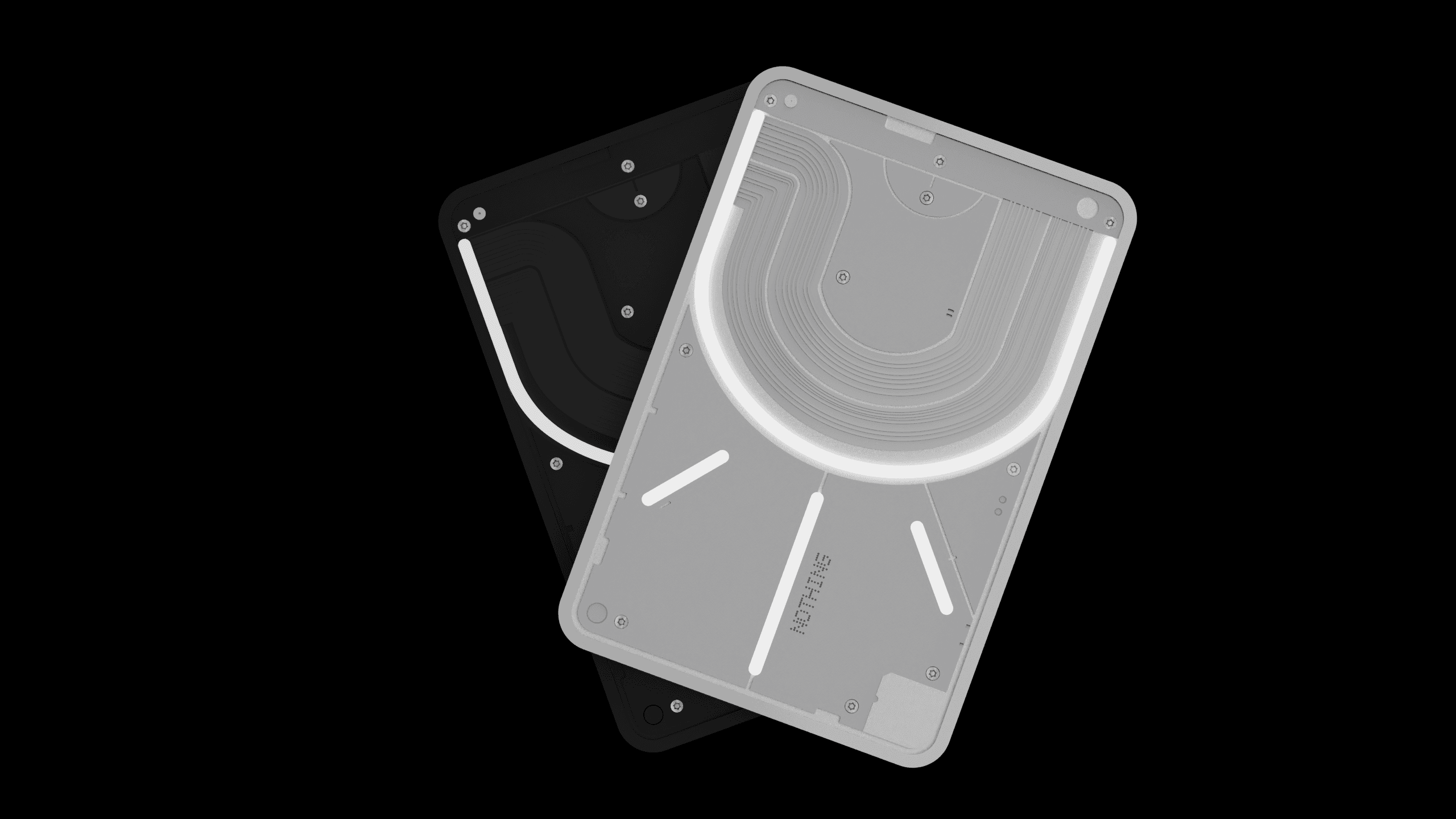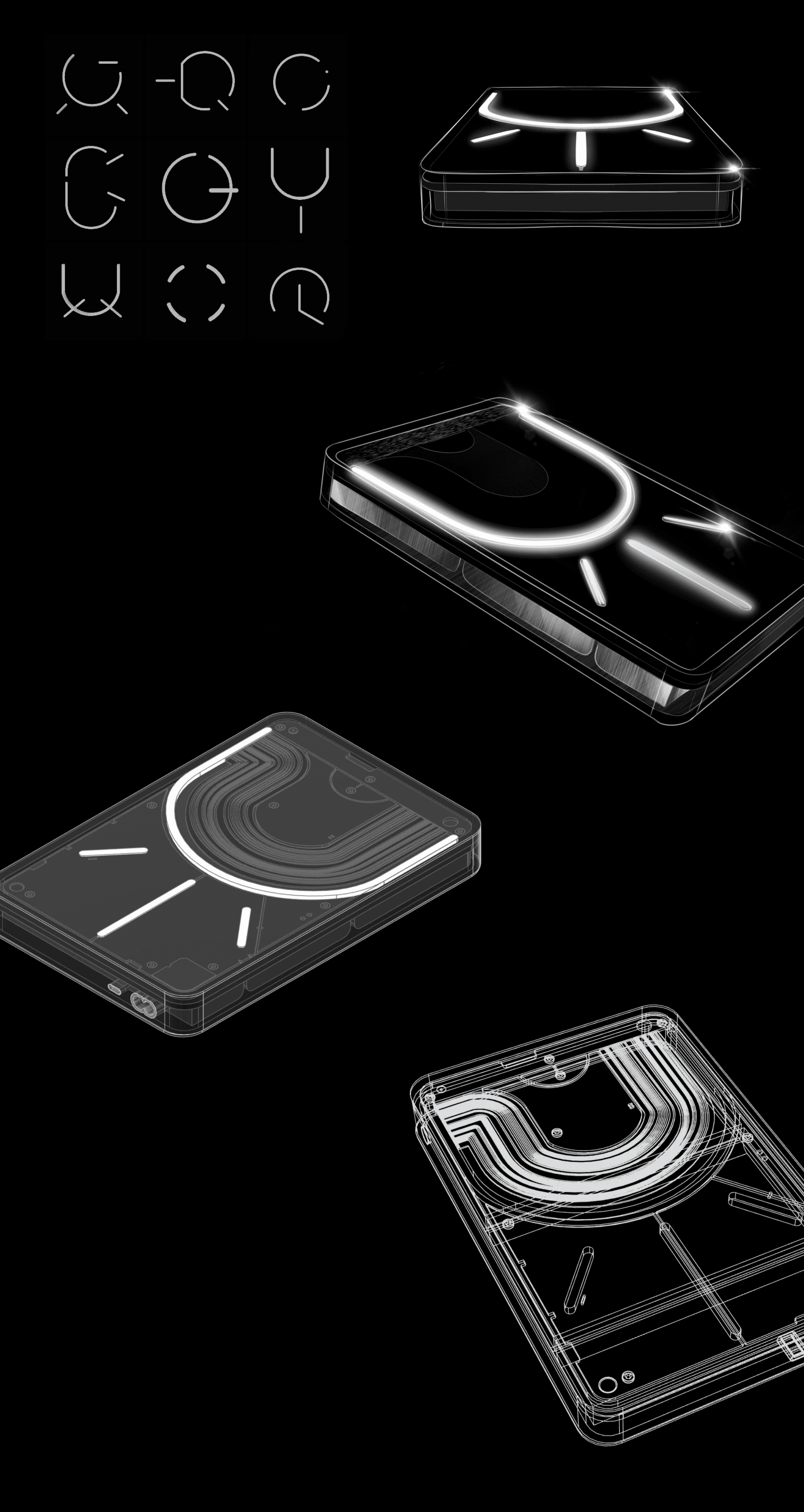 The final design features a sculpted, layered body with transparent and opaque surfaces that frame the Glyph lighting system.