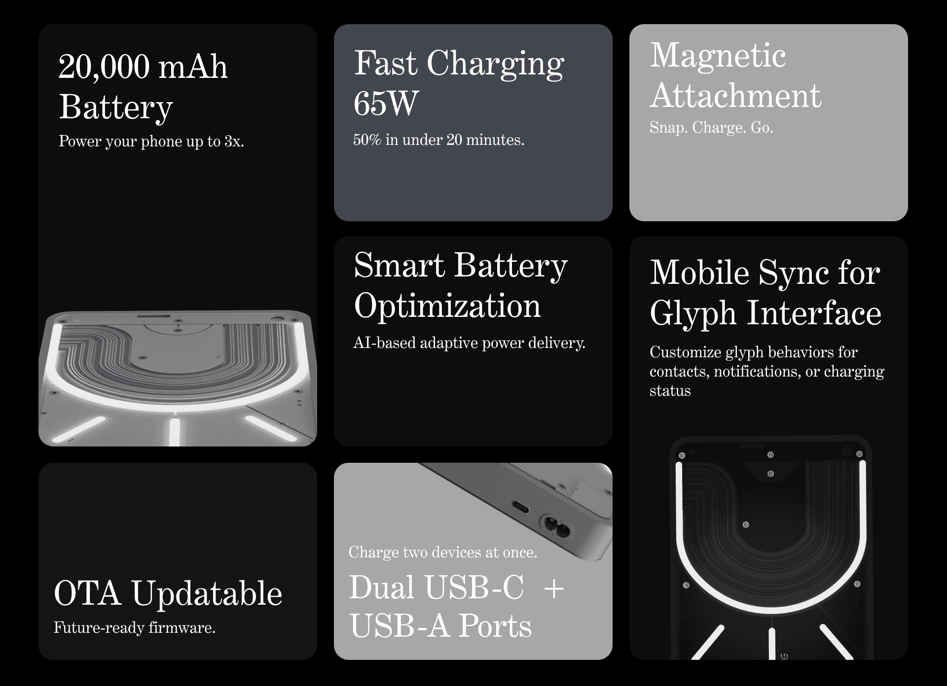 By integrating Nothing’s signature Glyph lighting system, the power bank becomes an active object that mirrors notifications, charging states, and system feedback from the connected phone. The result is a product that feels alive, responsive, and visually distinct while staying minimal and purposeful.